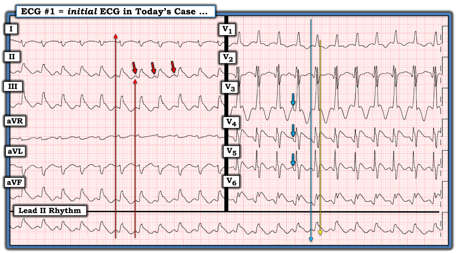 - It looks like the rhythm in Figure-1 is sinus (Don’t the RED arrows in lead II look like upright, conducting sinus P waves?).