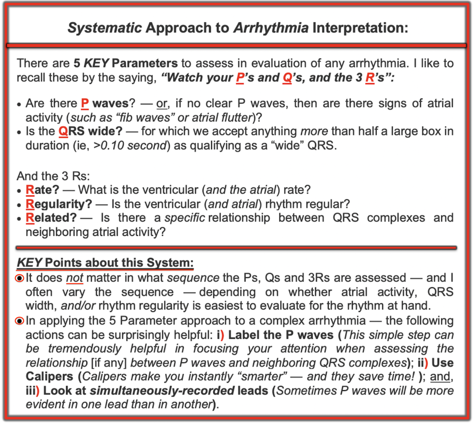 • In this 2:30-minute video (67MB- mp410/27/2025) — I quickly review my user-friendly Systematic Approach to rhythm interpretation that will: i) Speed Up your interpretations; ii) Increase your accuracy; and, iii) Narrow your differential diagnosis, as well as allowing you to sound intelligent — even if you are not certain what the rhythm is.