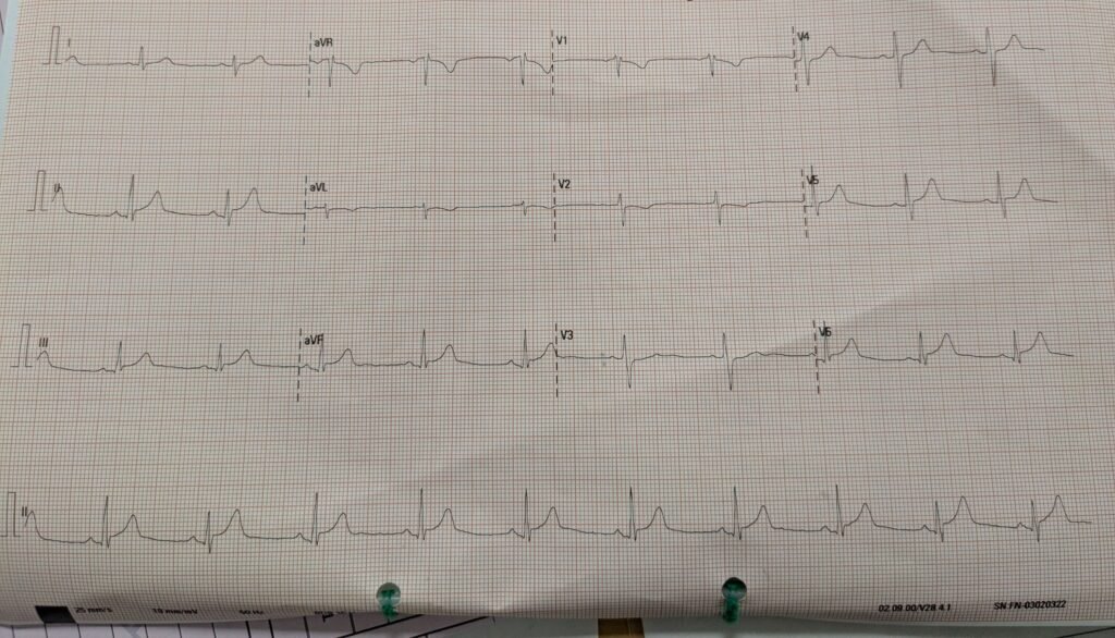 The conventional computer algorithm gave a diagnosis of “Normal ECG“. It was shown to the triage physician who signed off as “Normal/No concern.”