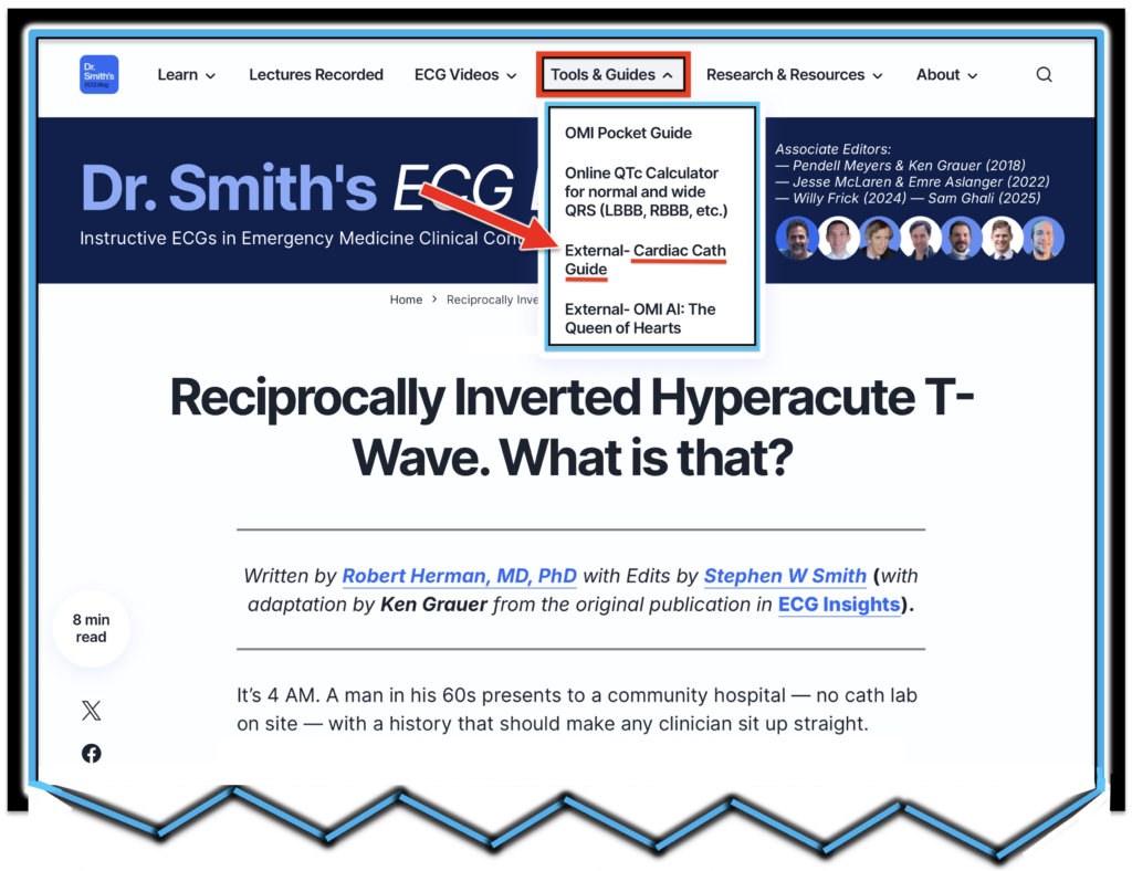 In the MENU at the Top of every page of Dr. Smith’s ECG Blog — You can instantly find Dr. Willy Frick’s Cardiac Cath Guide.