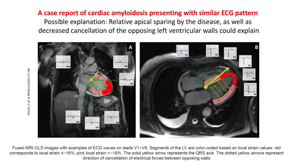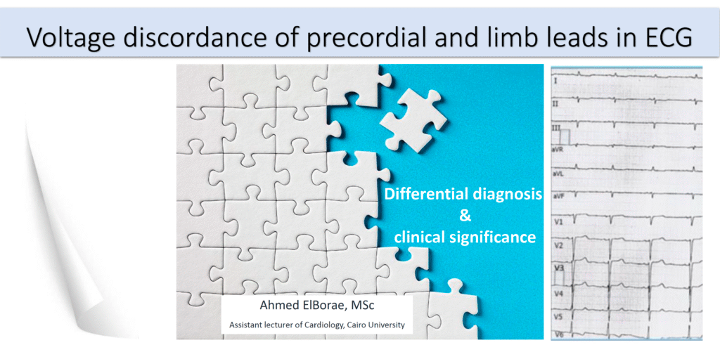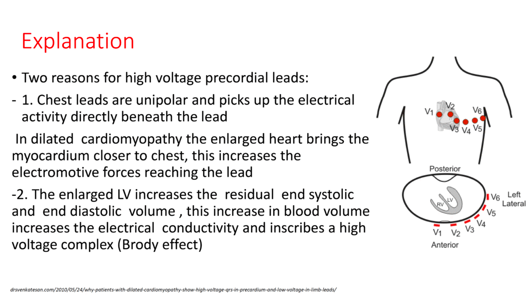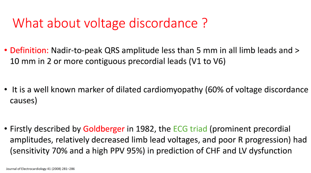 - In the remainder of cases of “Voltage Discordance” — the patient will have a dilated cardiomyopathy. Physiologic explanation for why this ECG phenomenon is seen is discussed in 7 sequential figures below (adapted from a PDF presentation by Ahmed ElBorae, MSc — 2022, from Cairo University).