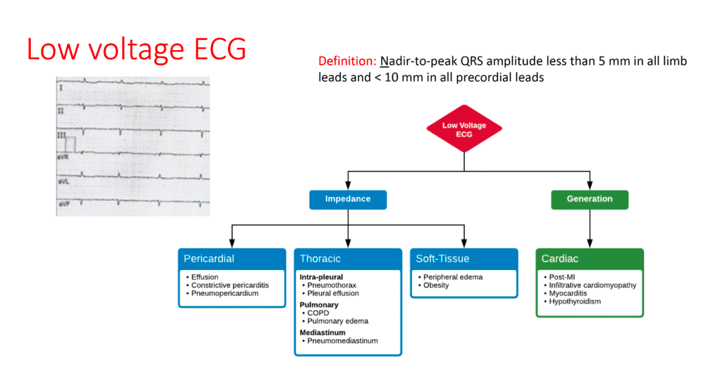 - On occasion there may be low voltage in the limb leads (ie, all QRS voltage in the limb leads ≤5 mm) — but normal QRS voltage in the chest leads. This is called, “Voltage Discordance” (Chinitz et al — J Electrocardiol 41(4):281-286, 2008).