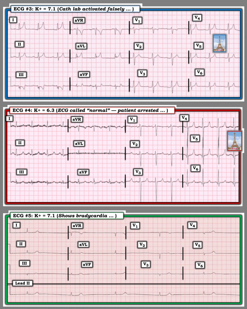 ECG 4: K = 6.3. Called “normal”. Patient arrested.