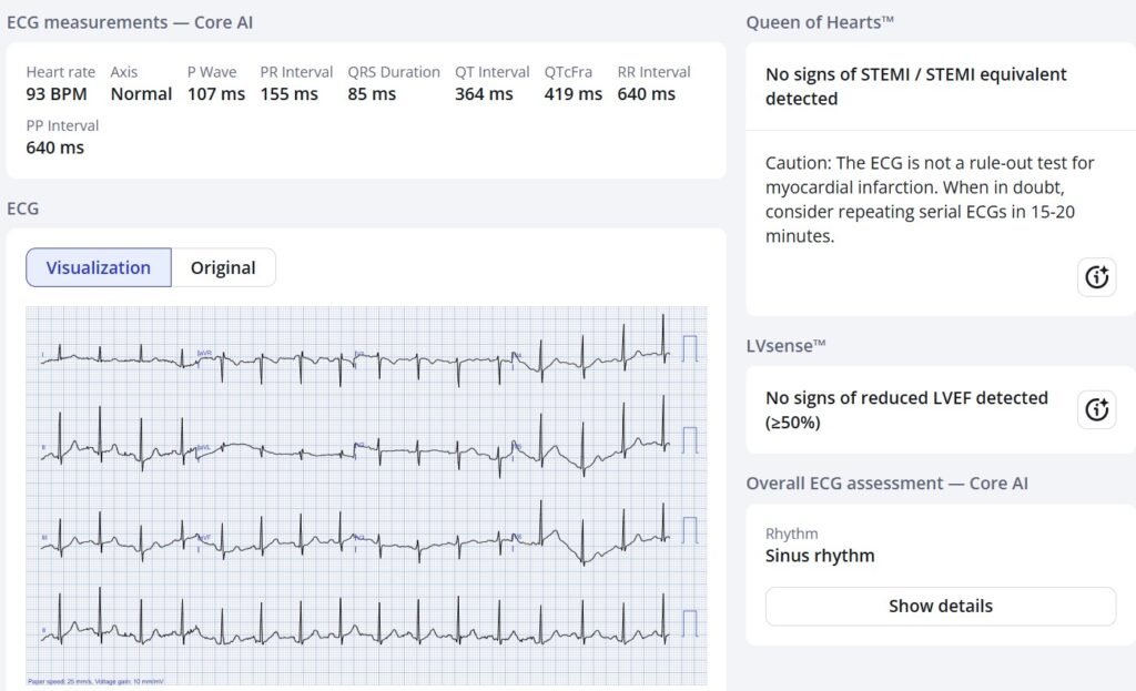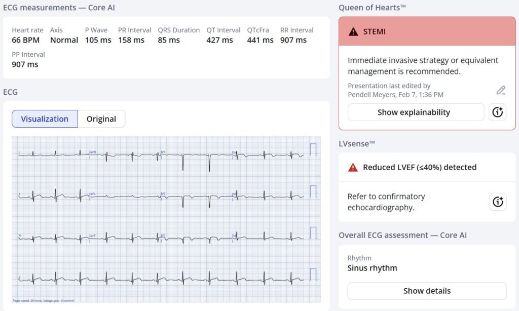You can also see that the Queen’s LVEF detection model has detected reduced EF (which was not present in the beginning of her OMI at arrival!).