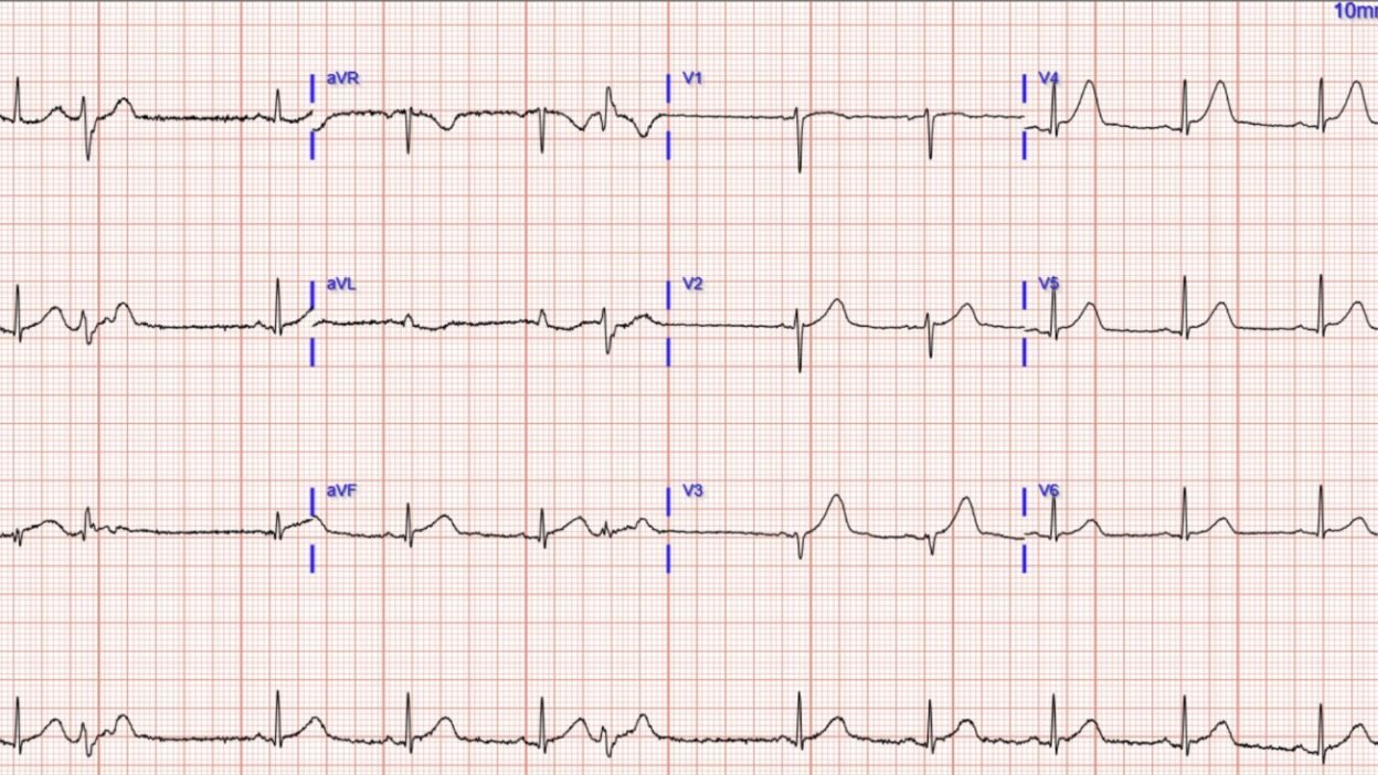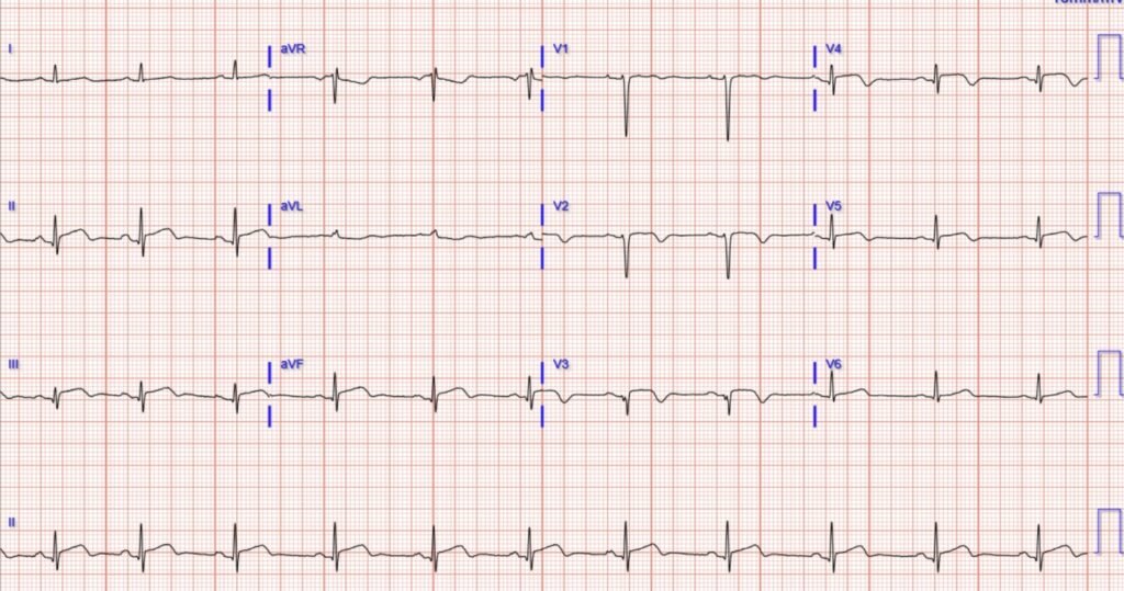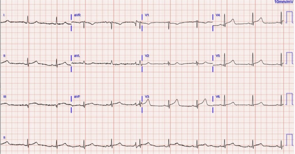 A woman in her 40s presented with acute chest pain. Her vitals were within normal limits. Here is her triage ECG:
