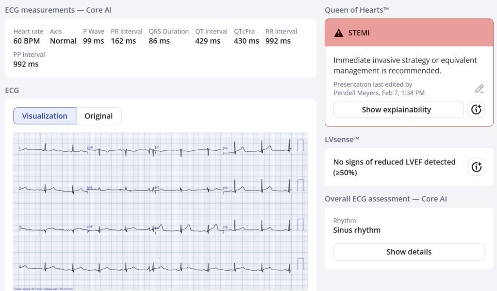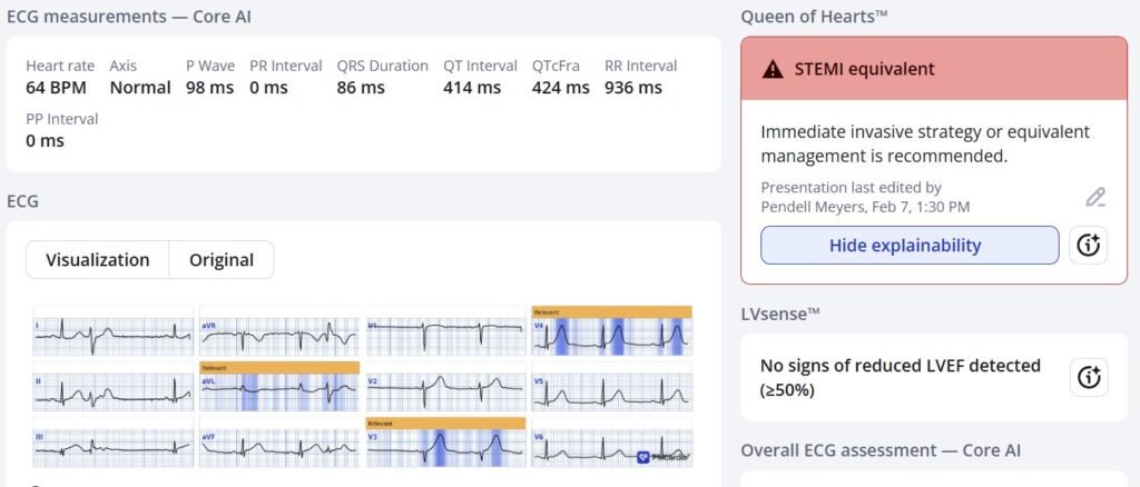 The Queen is trained to be very conservative, so even though our AI models can see there is some reperfusion pattern (terminal to full T wave inversion) occurring in many leads, the Queen still says “STEMI” because she doesn’t know there has been PCI, and there is persistent STE and signs of ongoing ischemia (likely because of the terrible delay to care, resulting in less benefit to intervention).